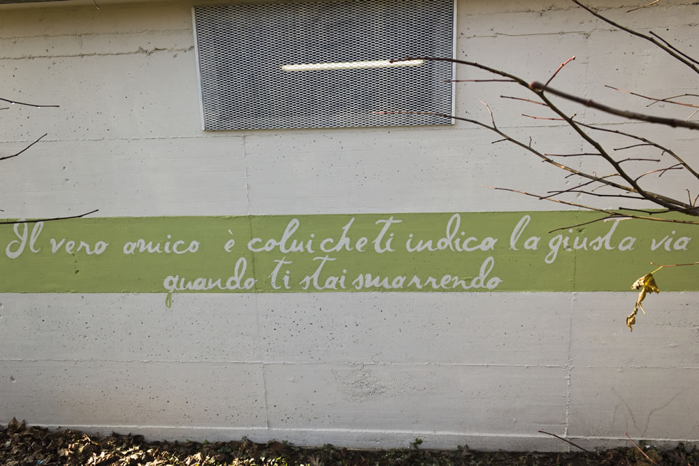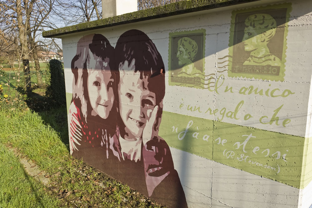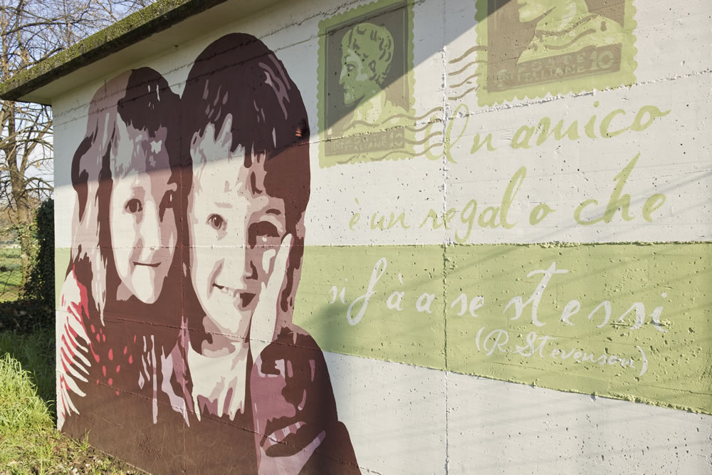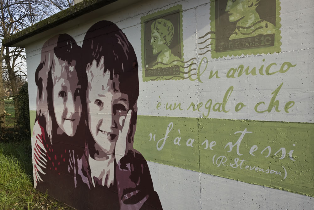 Il progetto si articola su tutti i quattro lati della cabina. Su una parete ci sono due bambini che si abbracciano, a testimonianza dell'affetto scaturito dalla loro amicizia. Sull'altra , invece, ho dipinto il volto di un bambino, a cui ho accostato un uccellino: questo per testimoniare anche le amicizie tra uomini e animali, infatti ho voluto riflettere su varie tipologie di amicizie che nella vita ci si presentano. Su entrambe le pareti, inoltre, ho disegnato dei francobolli con relativi timbri postali: testimonianza di quei rapporti che si sviluppavano non solo faccia a faccia, ma anche tramite corrispondenza con lettere cartacee. Poi ho aggiunto due frasi emblematiche sulla prima parete (la stessa dove ci sono i due bambini) : “Un amico è un regalo che si fa a se stessiâ€, citazione di Robert L. Stevenson. Sul lato opposto, invece, lo spazio è riservato esclusivamente all'aforisma: “Il vero amico è colui che ti indica la giusta via quando ti stai smarrendoâ€. La parte visiva è sicuramente la parte più immediata, subito intuibile, sia dai grandi che dai bambini che attraversano ogni giorno il cortile della scuola. Una volta soffermatosi sulla parte visiva il nostro occhio è attirato immediatamente sulla scritta e con questo secondo passaggio si ha la seconda chiave di lettura più matura e riflessiva; sorge allora una riflessione ispirata dalla parole che si sono lette. Con la visione totalitaria dell'opera e anche dell'ultima parte caratterizzata dai francobolli c'è poi il successivo spunto di riflessione ovvero il ricordo da parte dei più grandi dell'amicizia epistolare, quell'amicizia trasmessa e alimentata tramite corrispondenza. Su tutta la cabina poi ho dipinto una fascia verde, un colore che vuole emanare un senso di equilibrio e armonia. Per realizzare questo intervento di pittura murale dopo svariati schizzi e bozzetti sono partita dalla fase progettuale, caratterizzata dalla ricerca delle immagini che poi mi ha portato alla scelta di due di esse, più quella del francobollo. Per l'impostazione grafica e l'assemblamento del mio lavoro ho utilizzato il programma di fotoritocco Photoshop. Ho aumentato la saturazione dei colori regolandone anche l'intensità . Successivamente ho applicato il filtro “posterizza†realizzando un massimo di sei livelli. Una volta terminato il lavoro automatico del pc, sempre attraverso il programma grafico, ho affinato i contorni e sostituito colori che non si addicevano al mio lavoro cercando di renderli comuni ad entrambe le immagini. Di seguito, seguendo la struttura della cabina che è divisa in fasce, ho scelto la striscia verde come collegamento tra le varie facce e le relative parti del mio progetto. La striscia è poi la superficie su cui ho realizzato le scritte. Come ultimo passaggio ho impostato, sempre con l'ausilio del pc, l'utlima parte progettuale del mio lavoro, ciò che è alla base dell'intera fase realizzativa del murale: ho semplificato al massimo i perimetri delle immagini per realizzare delle aree ciascuna delle quali aveva assegnato un numero corrispondente ad un determinato colore.