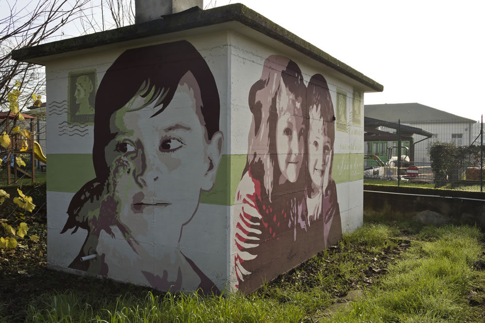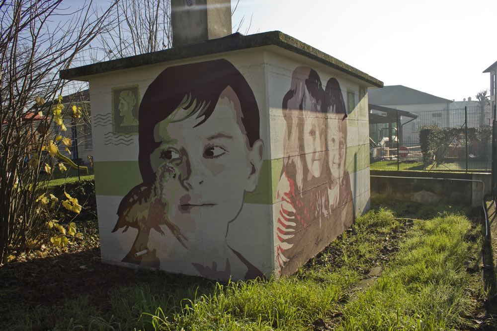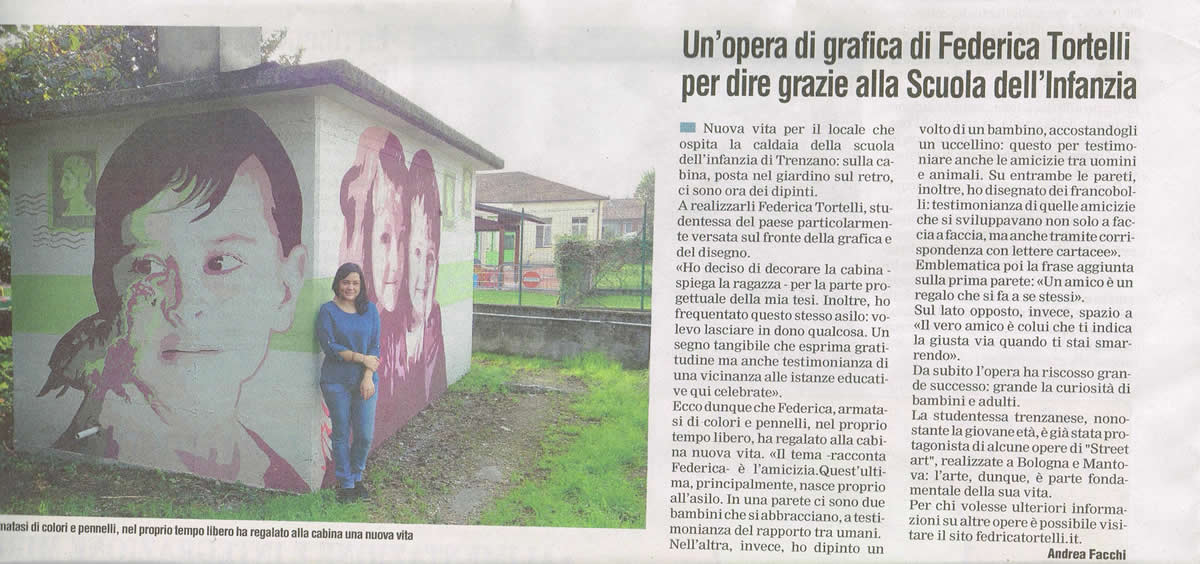 Il progetto si articola su tutti i quattro lati della cabina. Su una parete ci sono due bambini che si abbracciano, a testimonianza dell'affetto scaturito dalla loro amicizia. Sull'altra , invece, ho dipinto il volto di un bambino, a cui ho accostato un uccellino: questo per testimoniare anche le amicizie tra uomini e animali, infatti ho voluto riflettere su varie tipologie di amicizie che nella vita ci si presentano. Su entrambe le pareti, inoltre, ho disegnato dei francobolli con relativi timbri postali: testimonianza di quei rapporti che si sviluppavano non solo faccia a faccia, ma anche tramite corrispondenza con lettere cartacee. Poi ho aggiunto due frasi emblematiche sulla prima parete (la stessa dove ci sono i due bambini) : “Un amico è un regalo che si fa a se stessiâ€, citazione di Robert L. Stevenson. Sul lato opposto, invece, lo spazio è riservato esclusivamente all'aforisma: “Il vero amico è colui che ti indica la giusta via quando ti stai smarrendoâ€. La parte visiva è sicuramente la parte più immediata, subito intuibile, sia dai grandi che dai bambini che attraversano ogni giorno il cortile della scuola. Una volta soffermatosi sulla parte visiva il nostro occhio è attirato immediatamente sulla scritta e con questo secondo passaggio si ha la seconda chiave di lettura più matura e riflessiva; sorge allora una riflessione ispirata dalla parole che si sono lette. Con la visione totalitaria dell'opera e anche dell'ultima parte caratterizzata dai francobolli c'è poi il successivo spunto di riflessione ovvero il ricordo da parte dei più grandi dell'amicizia epistolare, quell'amicizia trasmessa e alimentata tramite corrispondenza. Su tutta la cabina poi ho dipinto una fascia verde, un colore che vuole emanare un senso di equilibrio e armonia. Per realizzare questo intervento di pittura murale dopo svariati schizzi e bozzetti sono partita dalla fase progettuale, caratterizzata dalla ricerca delle immagini che poi mi ha portato alla scelta di due di esse, più quella del francobollo. Per l'impostazione grafica e l'assemblamento del mio lavoro ho utilizzato il programma di fotoritocco Photoshop. Ho aumentato la saturazione dei colori regolandone anche l'intensità . Successivamente ho applicato il filtro “posterizza†realizzando un massimo di sei livelli. Una volta terminato il lavoro automatico del pc, sempre attraverso il programma grafico, ho affinato i contorni e sostituito colori che non si addicevano al mio lavoro cercando di renderli comuni ad entrambe le immagini. Di seguito, seguendo la struttura della cabina che è divisa in fasce, ho scelto la striscia verde come collegamento tra le varie facce e le relative parti del mio progetto. La striscia è poi la superficie su cui ho realizzato le scritte. Come ultimo passaggio ho impostato, sempre con l'ausilio del pc, l'utlima parte progettuale del mio lavoro, ciò che è alla base dell'intera fase realizzativa del murale: ho semplificato al massimo i perimetri delle immagini per realizzare delle aree ciascuna delle quali aveva assegnato un numero corrispondente ad un determinato colore.